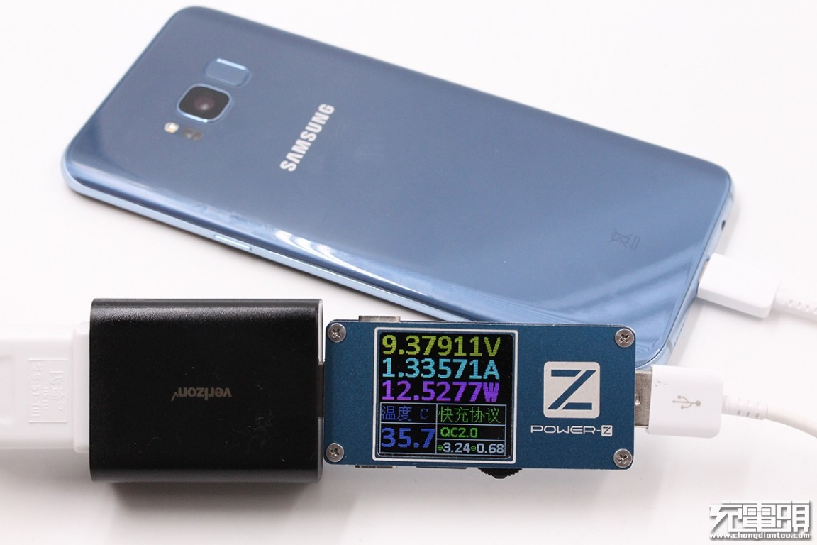 Use this charger to charge Samsung S8 Plus, voltage 9.37V, current 1.33A, charging power 12.52W, support QC2.0 fast charge.