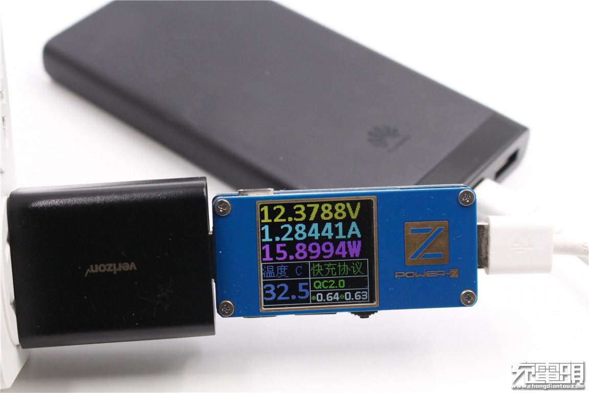 It is used to charge Huawei AP08Q mobile power supply, showing charging voltage is 12.37V, current is 1.28A, charging power is about 15.89W, and QC2.0 fast charging is supported.
