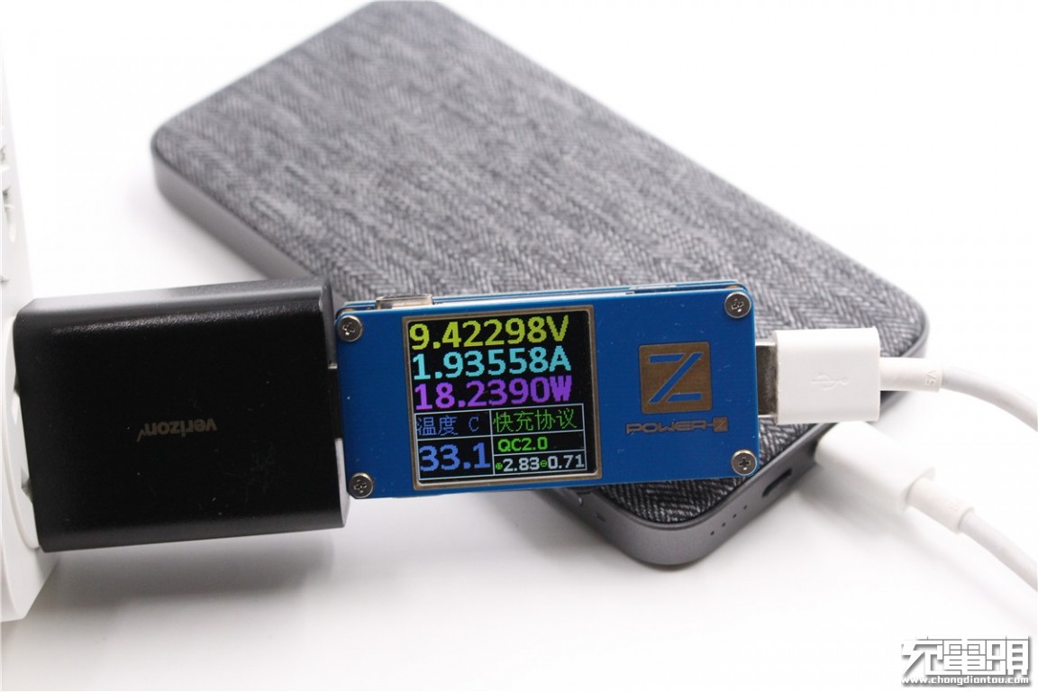 Charging the purple rice QB910 mobile power, showing the charging voltage is 9.42V, current 1.93A, charging power is about 18.23W, support QC2.0 fast charge.