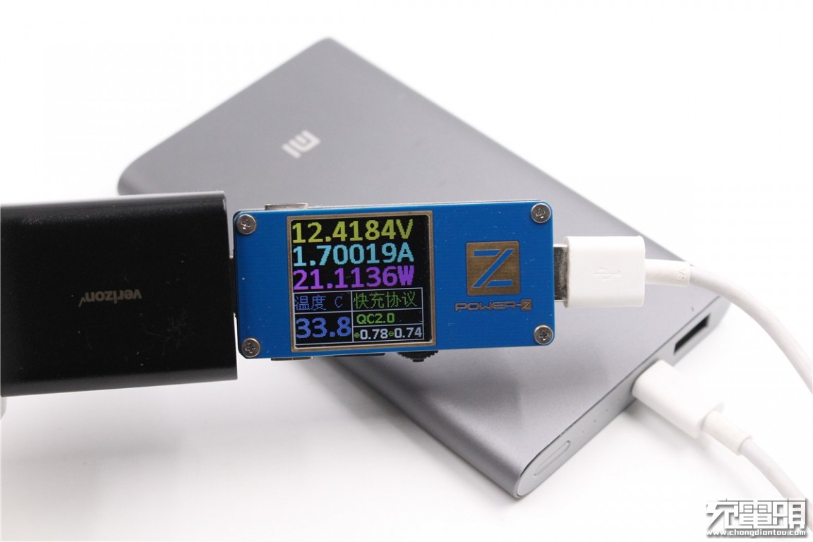 Charge the millet mobile power 10000mAh high version, showing the charging voltage is 12.41V, current 1.7A, charging power is about 21.11W, support QC2.0 fast charge.