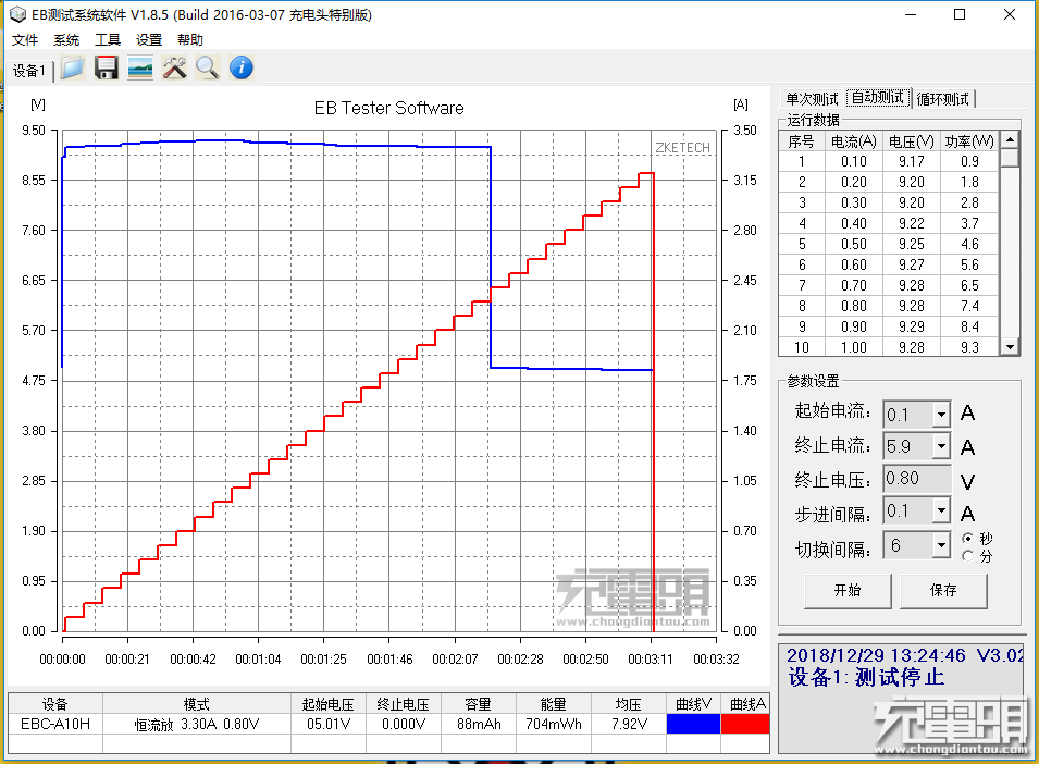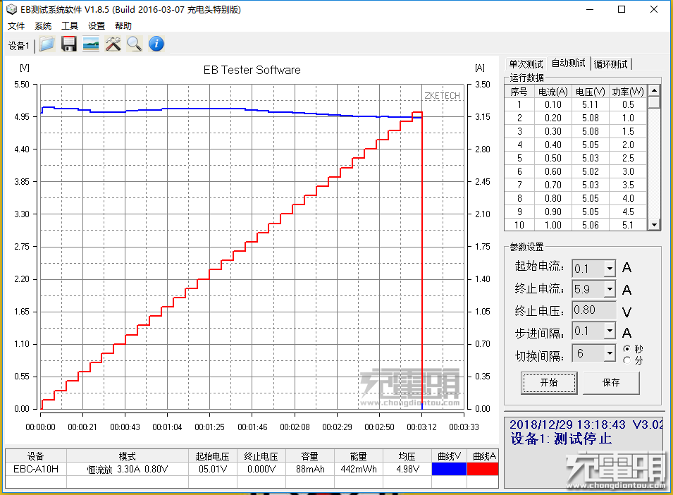 Using the EBD-USB electronic load to deceive, select 5V, 9V, 12V three output voltage modes, and test the current step curve of the charger at different output voltages.