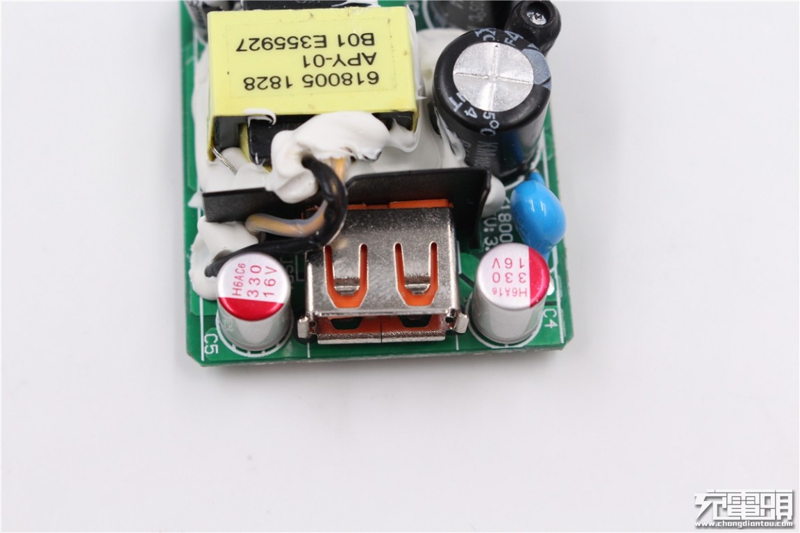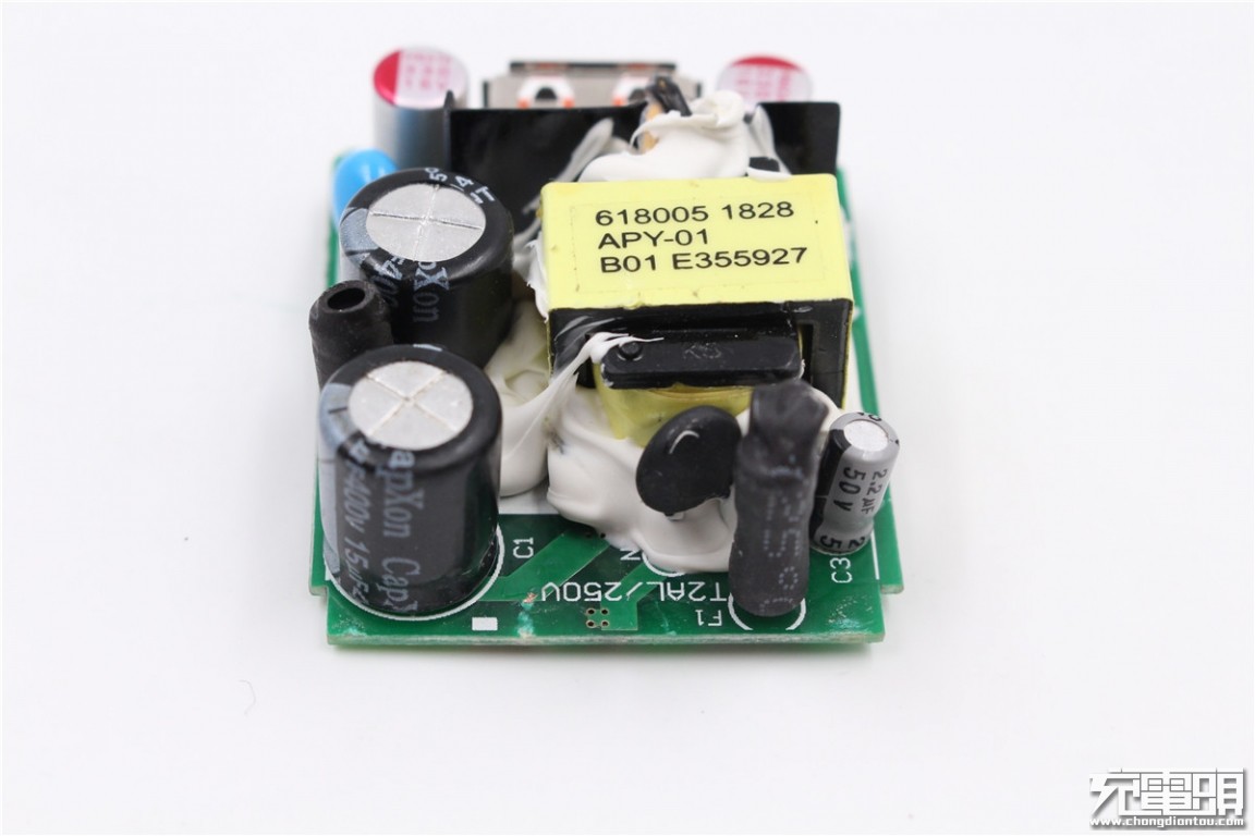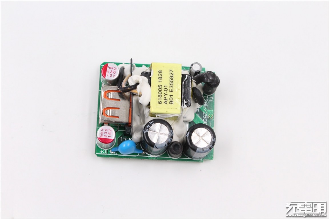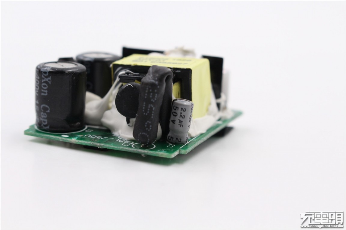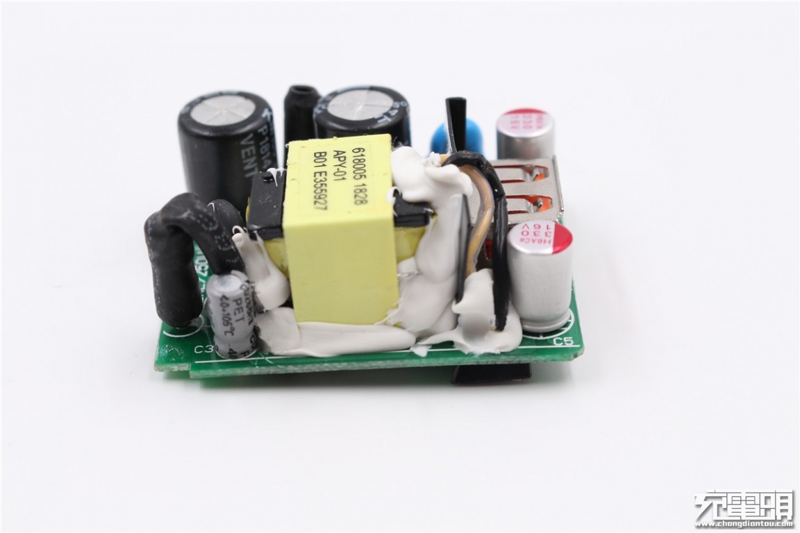 The front of the charger PCBA is a list of the front, you can see that the components are coated with white thermal glue.