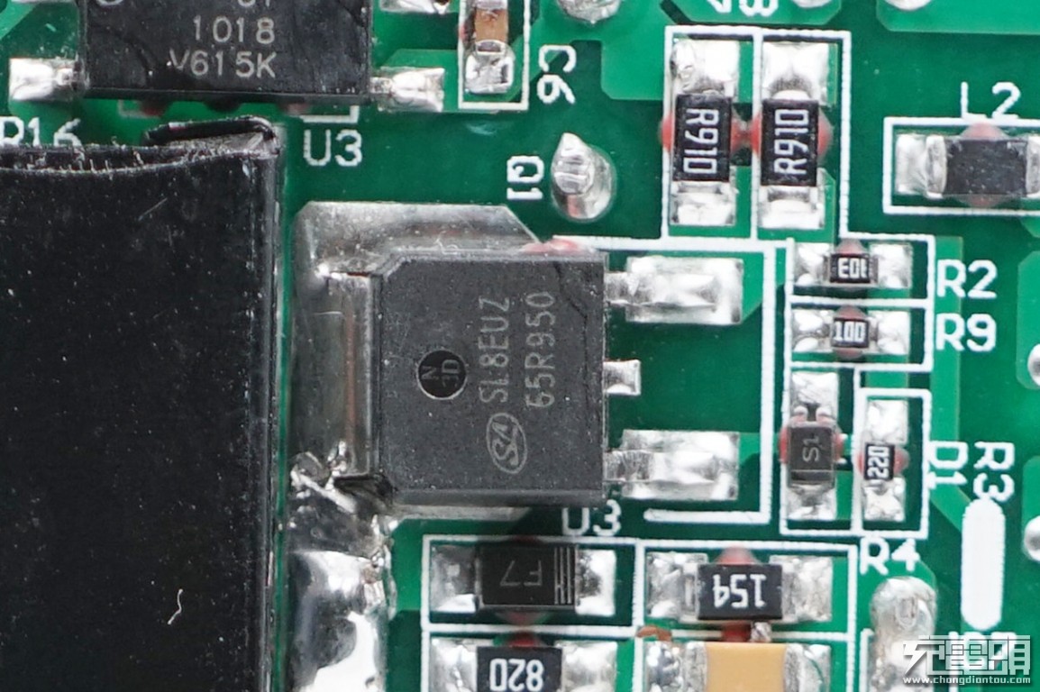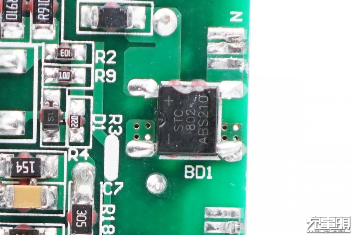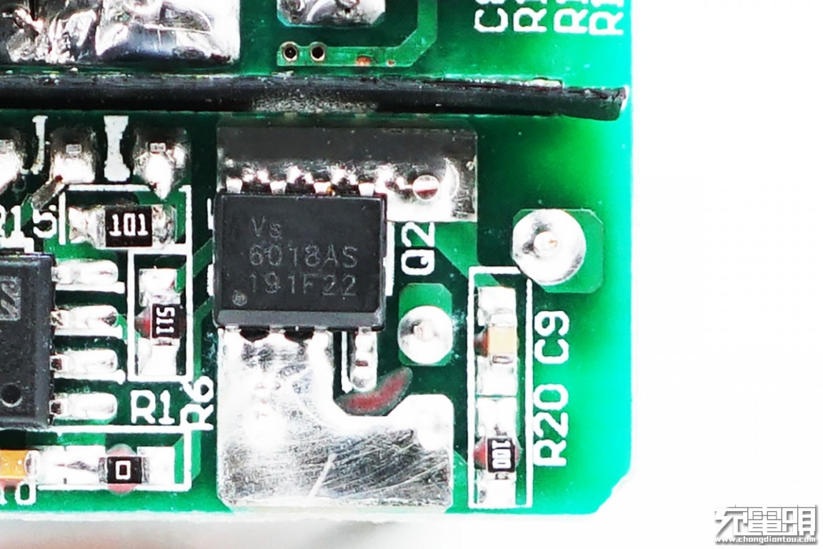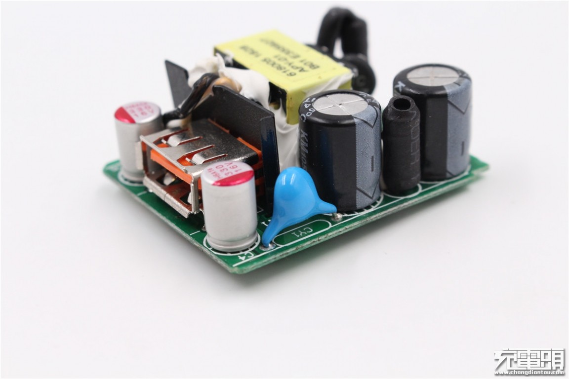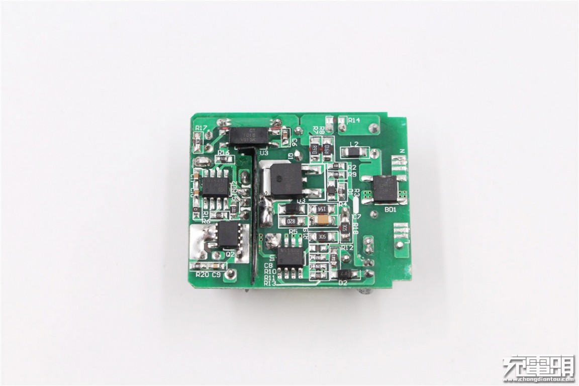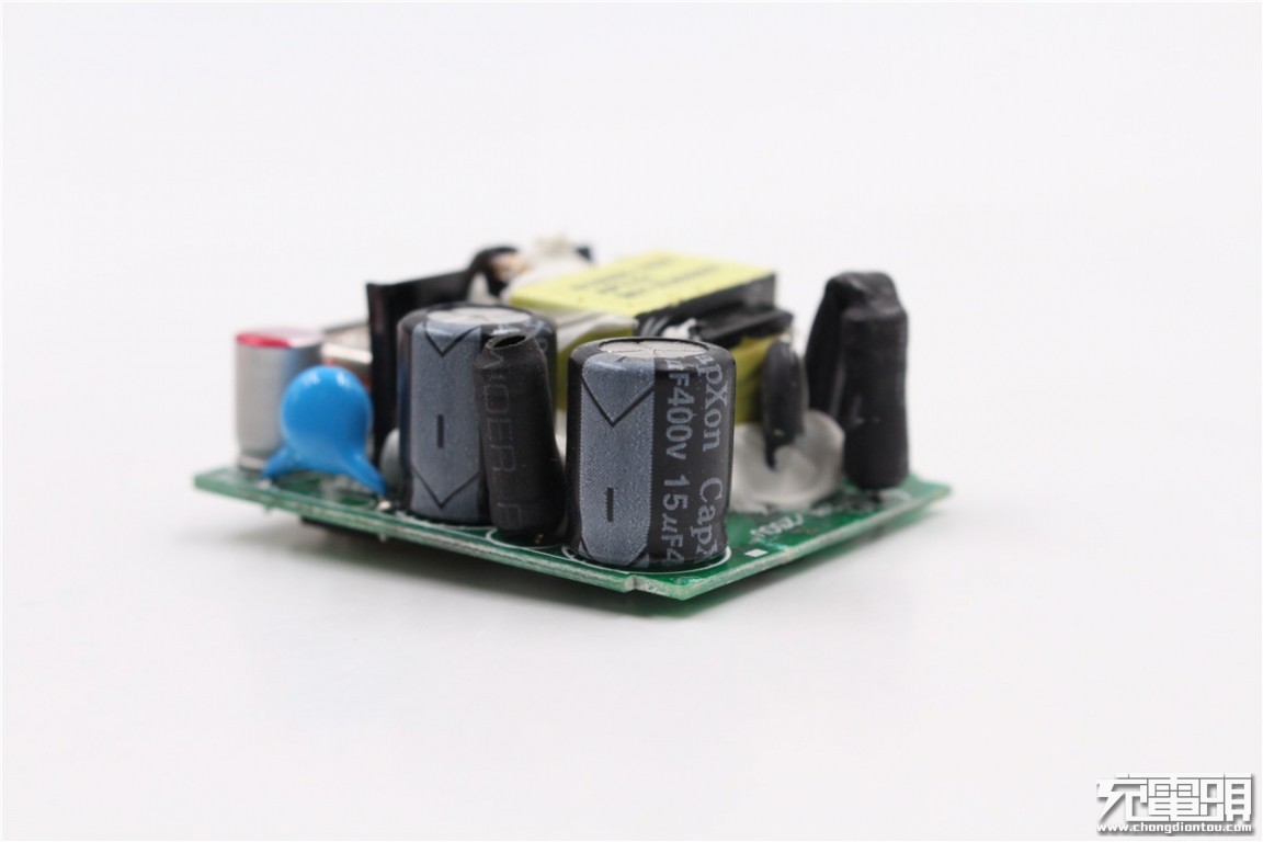 The front of the charger PCBA is a list of the front, you can see that the components are coated with white thermal glue.