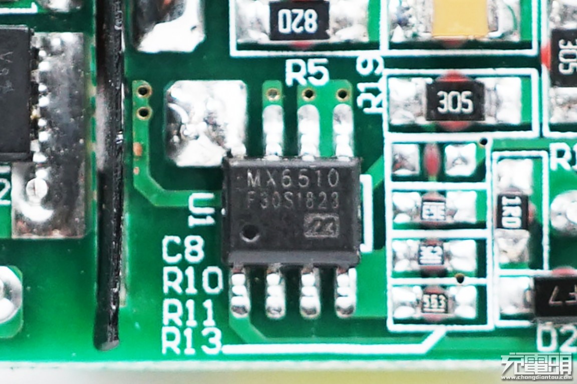 Primary PWM controller, chip from MIX-DESiGN Semiconductor, model MX6510. MX6510 adopts digital constant voltage constant current control method +QR technology, MX6510 is equipped with the company’s patented Smart-feedback (Intelligent Feedback Technology), using MIX-DESiGN MX6510 with the company’s secondary protocol and synchronous rectifier controller The MX5410 works together to achieve fast and smooth voltage regulation and accurate precise constant current characteristics at various segment voltages, while MJ-DESiGN is only required for MKT’s PE+1.1/2.0 protocol. Sai Semiconductor’s MX6510 can work independently in a similar PSR control mode, enabling a simpler peripheral circuit design without the need for secondary side protocol ICs and optocouplers.