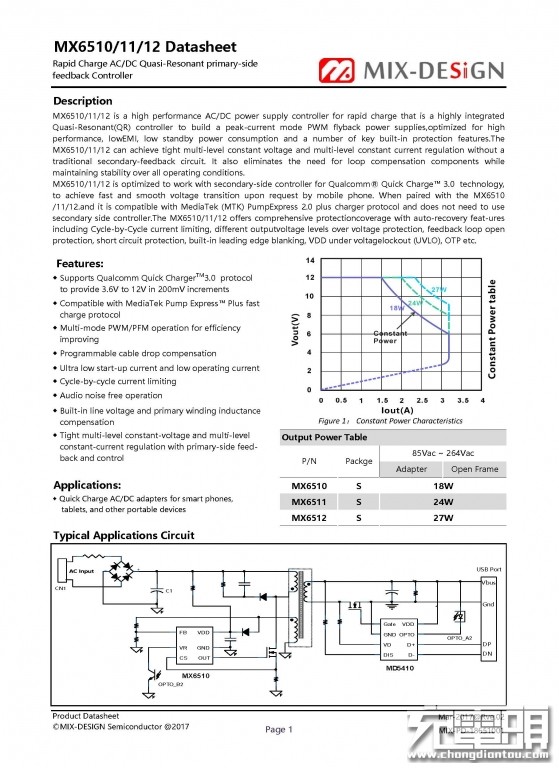 The MIX-DESiGN MX6510 has the following features: (1) Compatible with PE1.0/2.0 fast charging function, such as PE fast charging M6510 can work independently without secondary protocol IC and optocoupler device; (2) Support QC2.0/3.0 from 3.6V~20V with every 200Mv/step voltage adjustment; (3) Patented Smart-feedback, super-simplified peripheral circuit that satisfies the current constant current characteristics required for voltage output of different outputs; (4) Using digital CC/CV control technology, the system can work in multiple modes (PWM/PFM, etc.) to optimize conversion efficiency. (5) Ultra-low standby power consumption, the overall circuit standby is less than 40mW; (6) Digital quasi-resonant mode of operation, higher energy efficiency and better EMI characteristics; (7) 75V ultra-wide VCC range, eliminating the need for external VCC LDO circuits.
