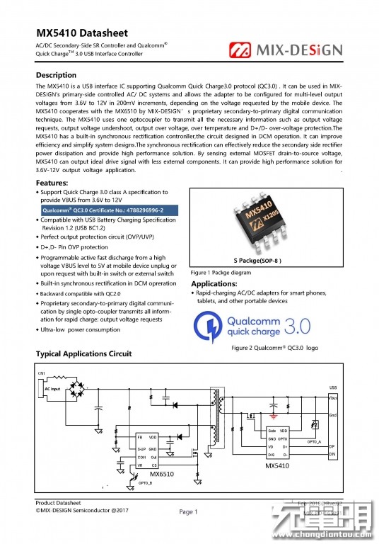MX5410 currently supports QC3.0 Class A specifications, supports BC1.2, is backward compatible with QC2.0, meets the current QC3.0 charger requirements; will be built in synchronous rectifier controller, no additional synchronous rectifier IC, the circuit is very simple; patent Smart-Feedback technology works with the company’s primary controller MX6510, eliminating the need for complex loop RC compensation devices, eliminating the need for current metal film detection circuitry for constant current, saving more PCB space and BOM cost; At the same time, it has perfect protection control circuit, D+, D-overvoltage protection, output OVP, UVP, OCP, OTP, etc.; product built-in variable programming fast discharge function, when the device is pulled out from the charger or unexpected, it will automatically output Fast down to 5V for safety.